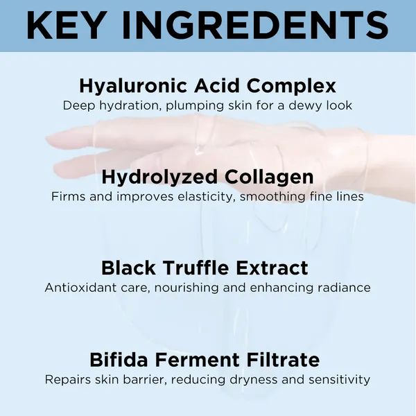 • Hyaluronic Acid (Multi-Type Complex) – Deep, long-lasting hydration