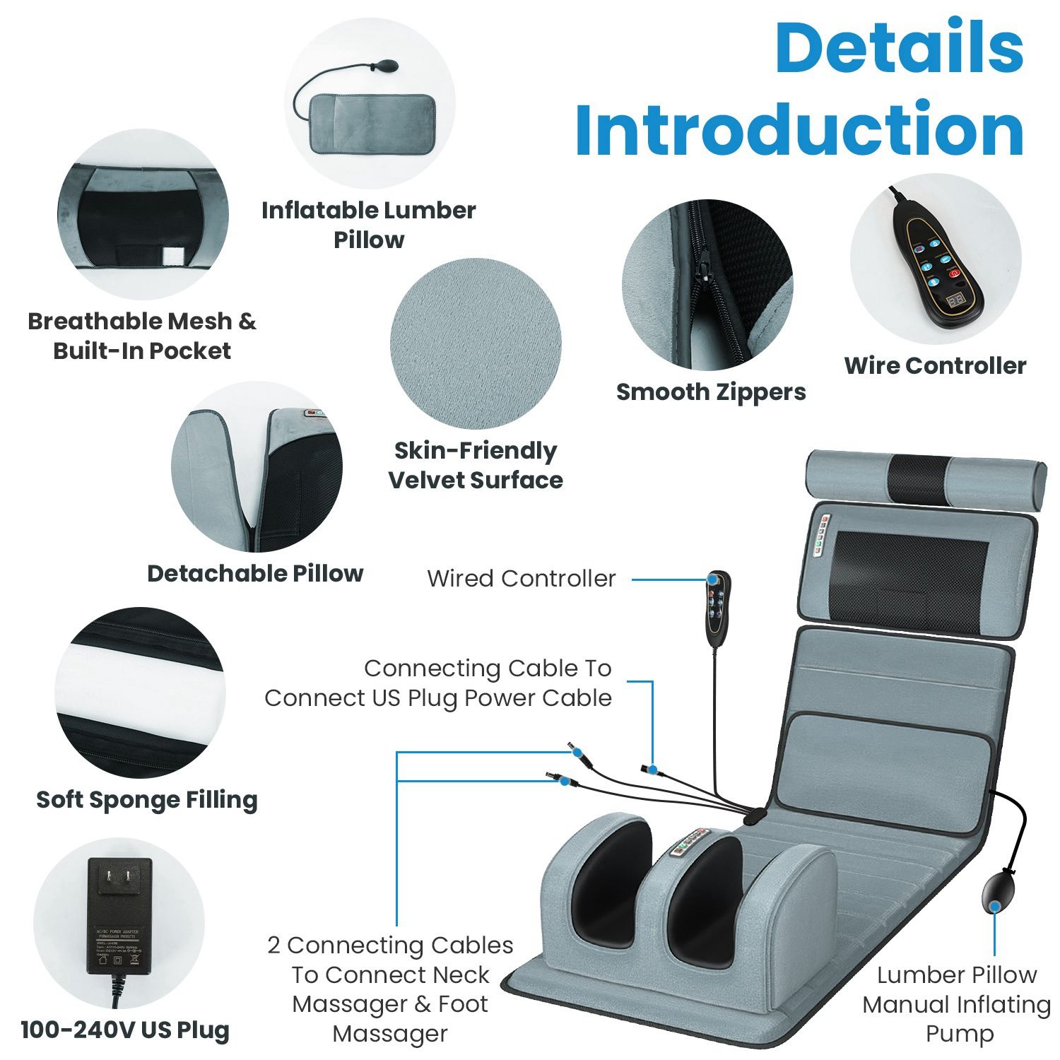 * The neck massage, foot massage, head pillow, and inflatable lumber pillow can be used individually. Just zip off the zippers on the neck massage, foot massage, head pillow to detach it from the full body massage mat.