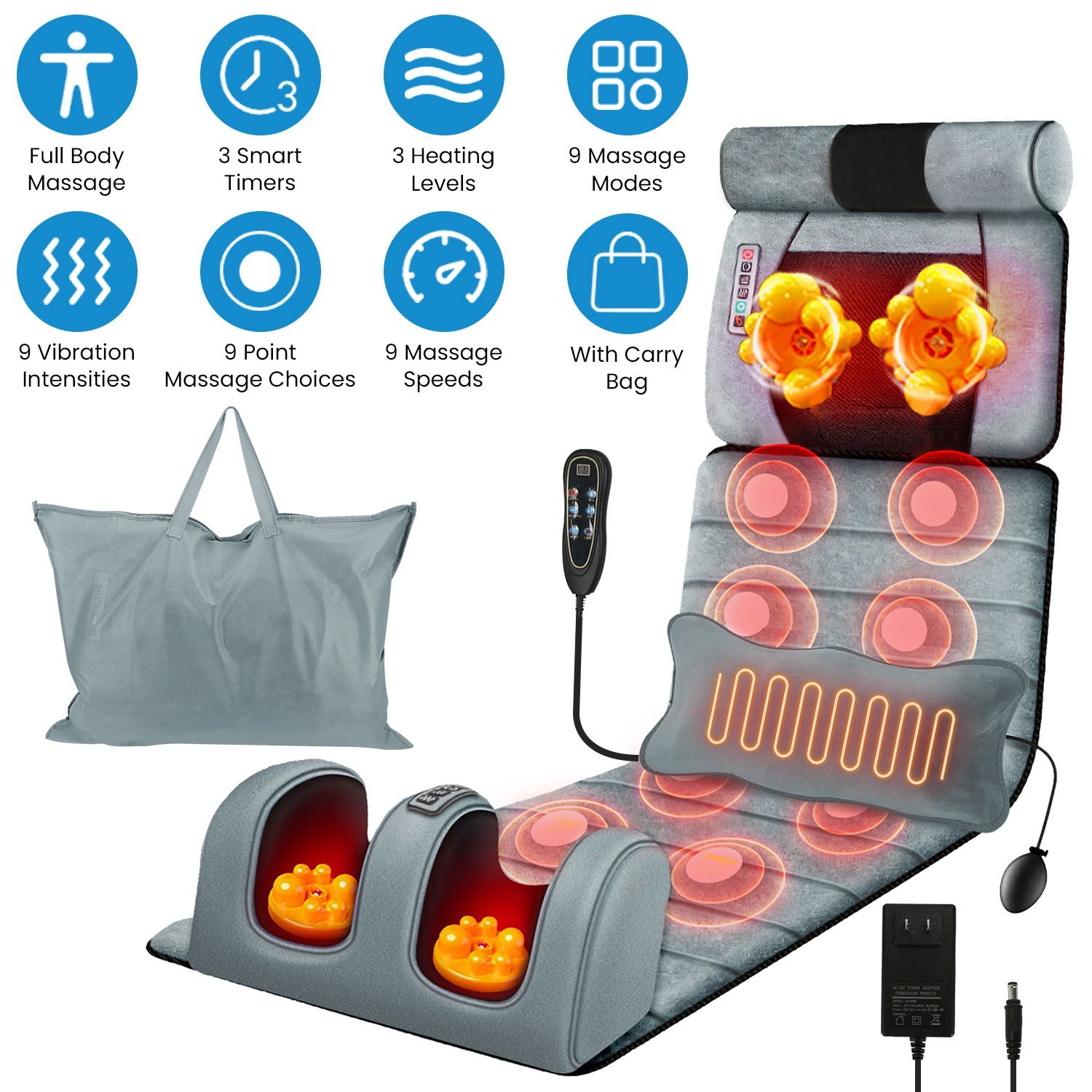 Multifunctional Massage Mat: Our full body massage mat features 10 massage points including Back, Buttock, Waist, Thigh, Calf, and heating therapy function on lumber zones, it\'s able to give you a therapeutic massage that helps release tension, stress, and fatigue after a long work day. You can choose 9 designated vibration modes, 9 point-selection vibration modes, 3-level heating levels and enjoy full control over 9-level vibration intensity and 9-level speeds as you hit all the right spots.