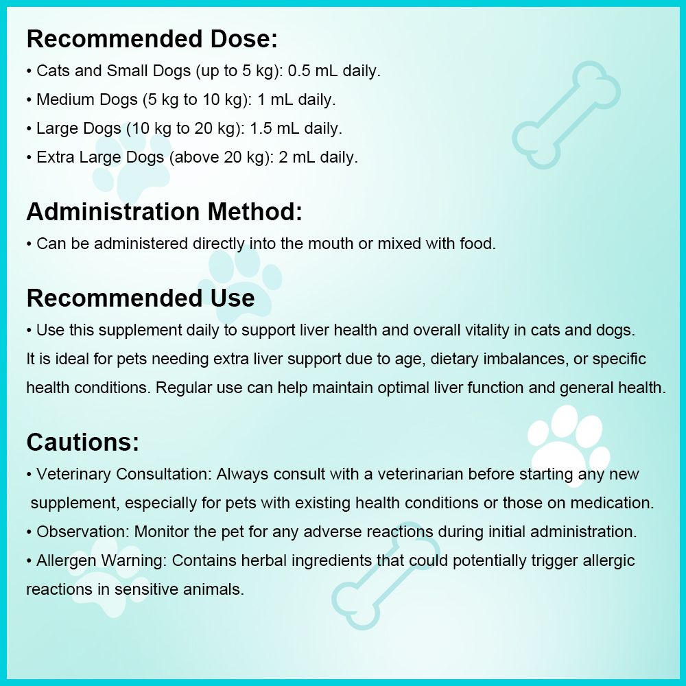 Introducing the Herbal Liver Support Supplement, a liquid dietary supplement specifically formulated for cats and dogs to promote optimal liver function and overall health. This potent blend of herbal extracts is designed to support liver detoxification, enhance vitality, and contribute to the general well-being of your pets.