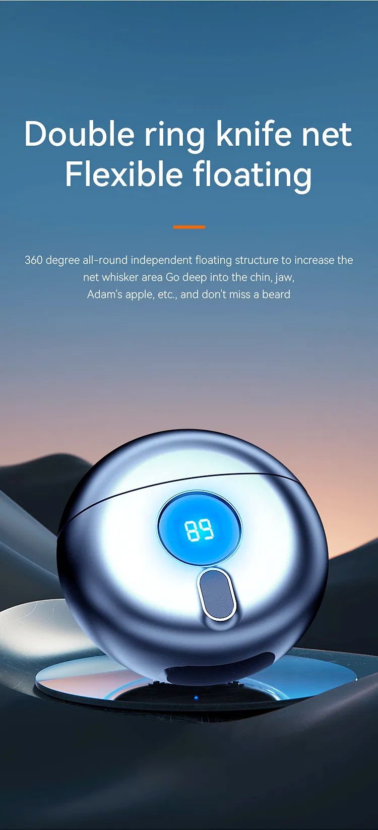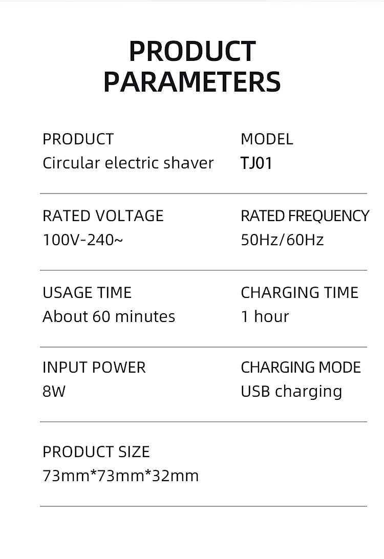Product parameters: Circular electric shaver- Product name: Mini electric razor- Item model number: TJ01- Charging: USB charging- Product size: 73*73*32mm- Product color: dark gray, champagne gold- Packing list: Mini electric razor x1,Portable storage bag x1,Charging cable x1, Instruction manual x1. Notice: Fully charge  before use.