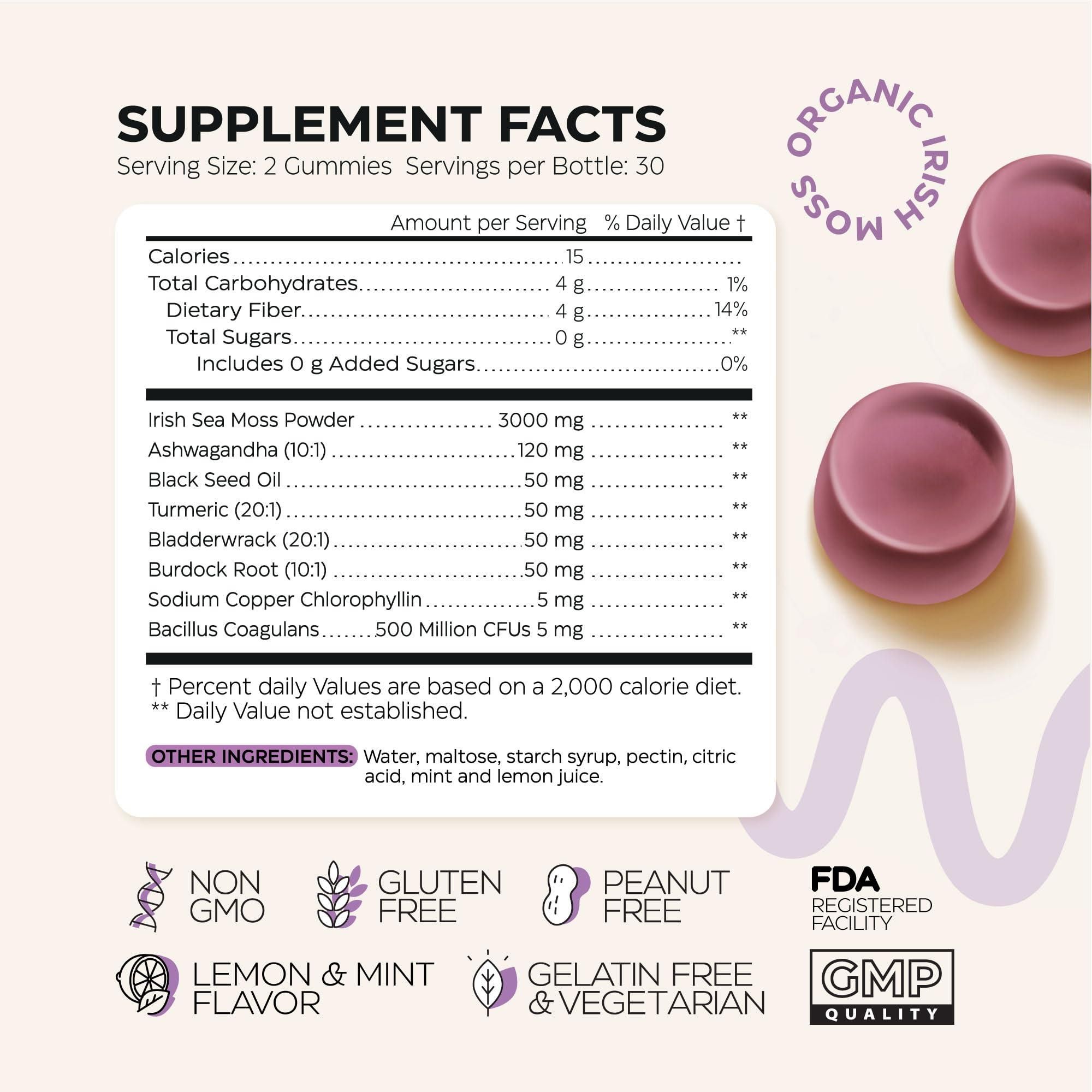 1.nutrient-rich blend for adults: our sea moss gummies formula includes black seed oil, ashwagandha, bladderwrack for skin and hair health, immunity and thyroid health maitenance, metabolism support.
