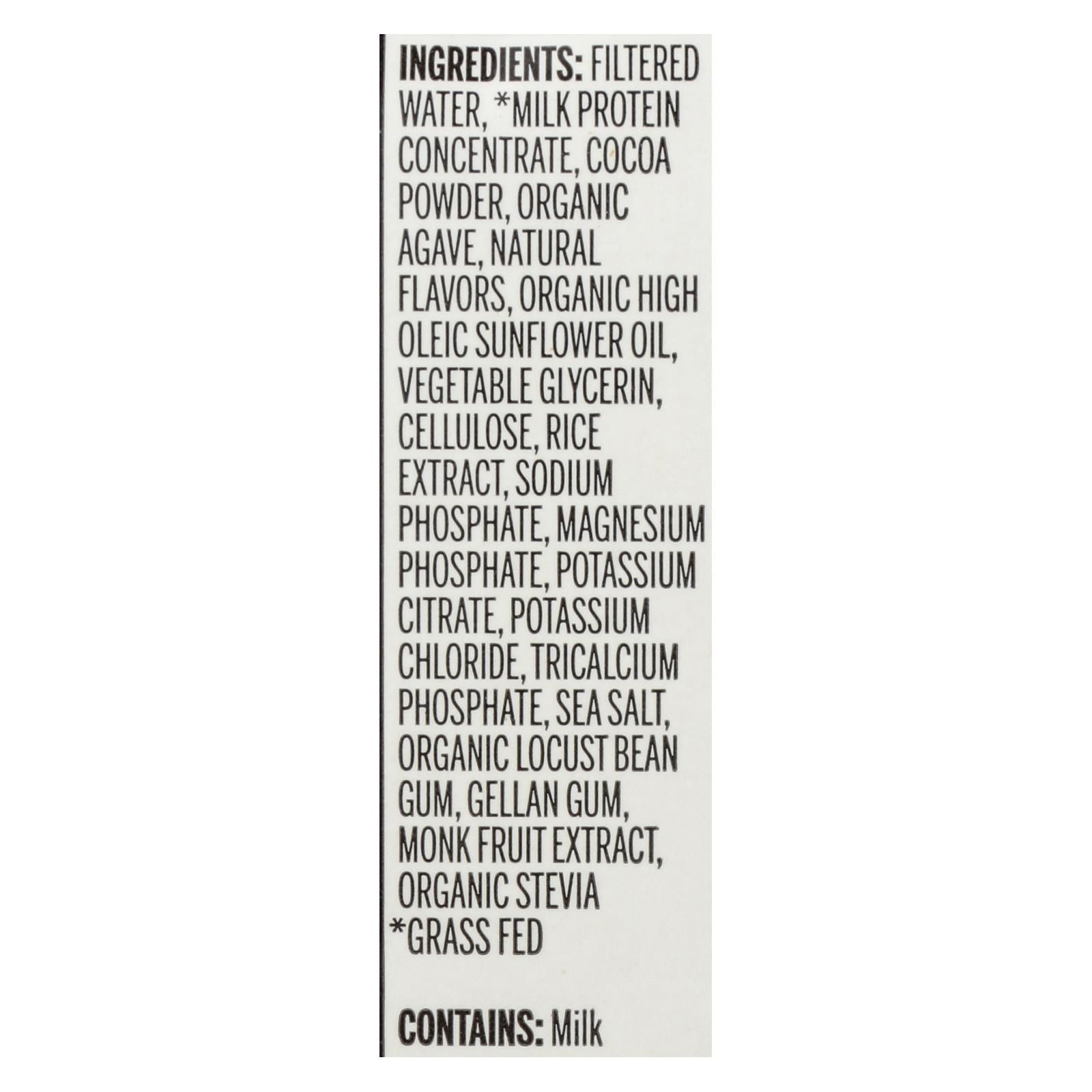 ingredients : filtered water;grass-fed milk protein concentrate;organic agave;cocoa powder;natural flavors;organic high oleic sunflower oil;vegetable glycerin;cellulose;sunflower lecithin;sodium polyphosphate;magnesium phosphate;potassium citrate;potassium chloride;tricalcium phosphate;sea salt;monk fruit extract;gellan gum;organic reb a (stevia extract);organic locust bean gum