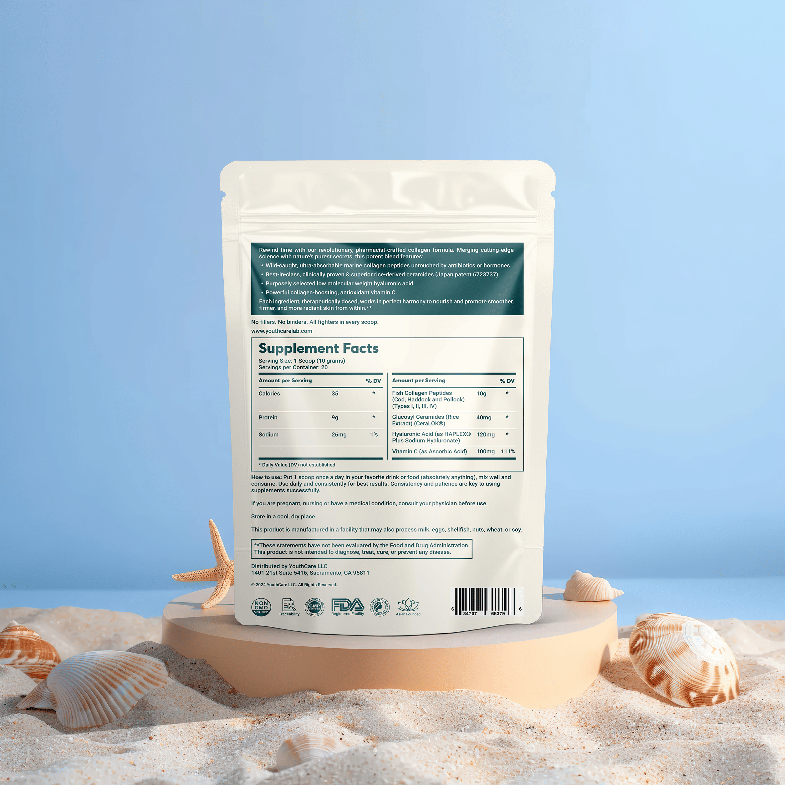 Fish Collagen Peptides (Types I, II, III, IV) 10,000 mg; Glucosyl Ceramides (Rice Extract) (CeraLOK®) 40 mg; Hyaluronic Acid (HAPLEX® Plus Sodium Hyaluronate) 120 mg; Vitamin C (Ascorbic Acid) 100 mg