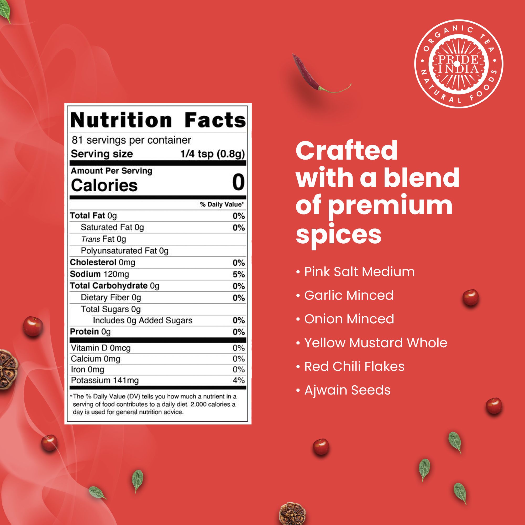 FRESH BLEND OF SPICES: This exquisite blend features an array of hand-picked ingredients, including Pink Salt, Garlic Minced, Onion Minced, Yellow Mustard Whole, Red Chili Flakes, and Ajwain Seeds. The pink salt provides a mineral-rich base, while garlic and onion powders infuse a savory depth, and the yellow mustard powder adds a mild tang. The subtle heat from the red chili powder is balanced by the unique essence of ajwain powder, creating a harmonious fusion of flavors that's perfect for a variety of dishes. This seasoning salt is your passport to a world of culinary possibilities, turning every meal into a delectable masterpiece, whether you're grilling, roasting, or simply seasoning your favorite snacks.