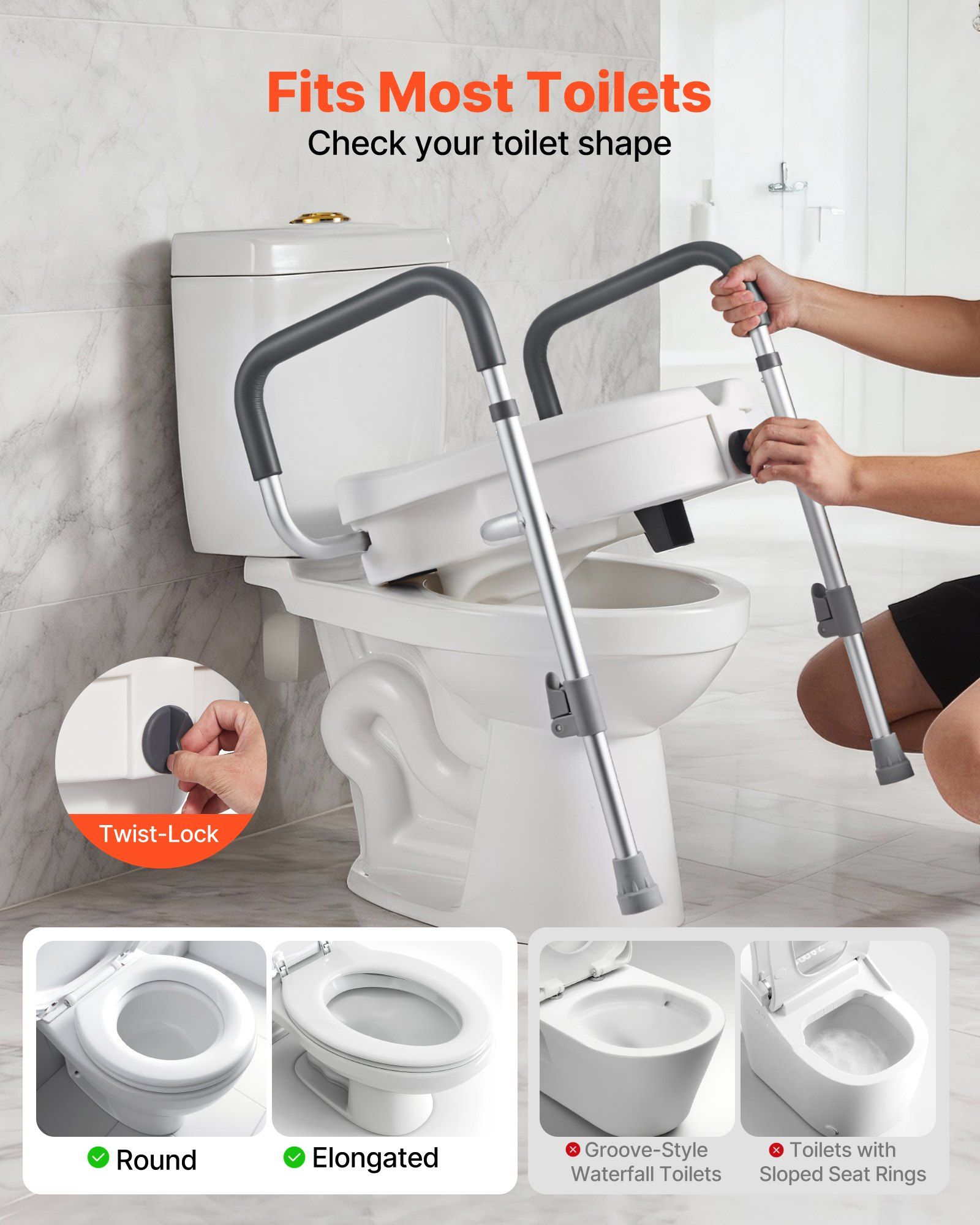 This toilet seat riser installs securely with a twist-lock mechanism. Before purchasing, check your toilet's shape and size to ensure a proper fit—refer to the images for compatible types.